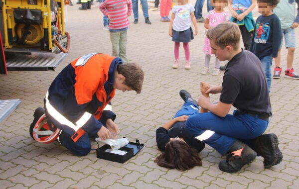Wir als Freiwillige/Jugendfeuerwehr dürfen zwar selber keine Erste-Hilfe Lehrgänge durchführen, allerdings gehört die Erste Hilfe mit zu den wichtigsten Aufgaben der Feuerwehr. Denn die richtige Erstversorgung eines Verletzten kann im Ernstfall schon Leben retten! Und nicht selten wird die Feuerwehr als erstes angesprochen, wenn bspw. auf einem Straßenfest der Kreislauf nicht richtig mitspielt. Im Ernstfall übernehmen dies natürlich die Betreuer, aber auch die Jugendlichen können jeder Zeit in die Rolle des Ersthelfer kommen, wenn sie draußen unterwegs sind. Und daher schaden ein paar Grundlagen, wie das korrekte Anlegen eines Druckverbandes, die stabile Seitenlage oder das korrekte Absetzen eines Notrufes nicht.